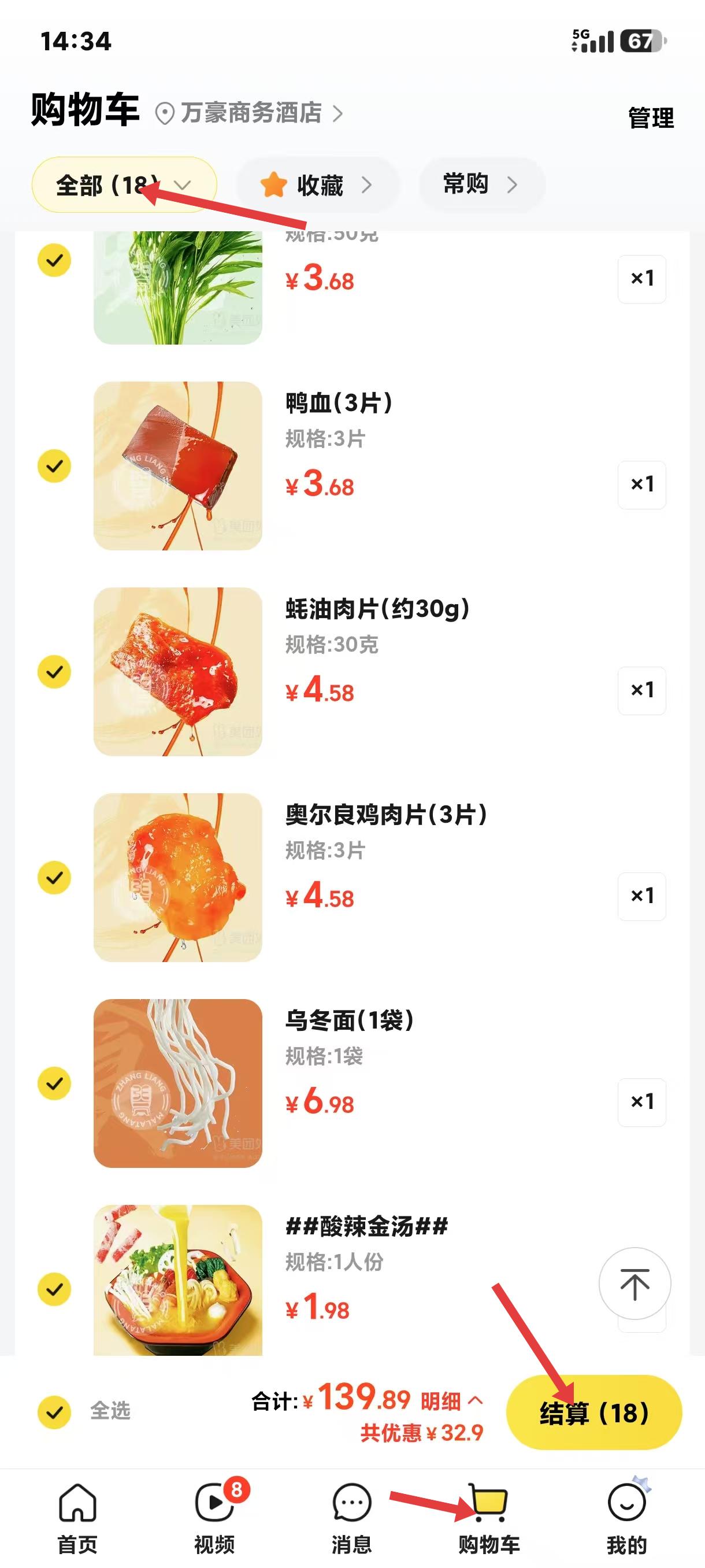 2、美團安卓版購物車,定位萬豪商務酒店,青菜、鴨血等18件商品已勾選待結算,明細顯示合計139元、共優惠32元,清晰呈現消費清單方便核對。