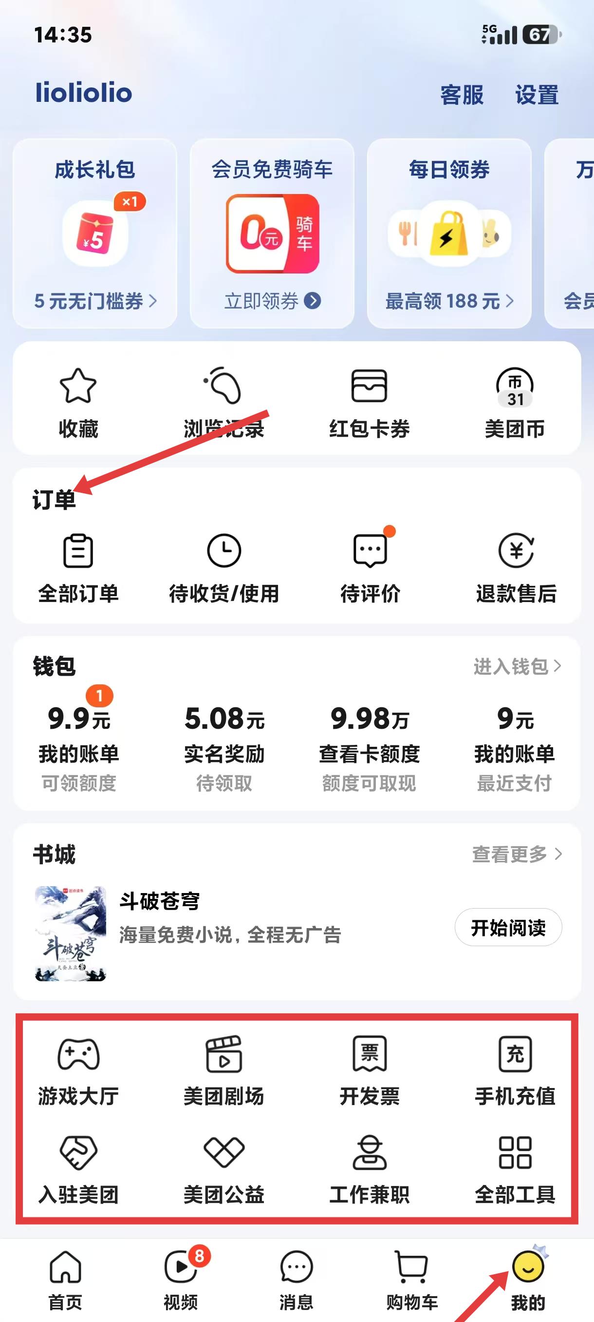 3、打開美團安卓版我的頁面,成長禮包、會員騎車等福利醒目,訂單模塊分類清晰,錢包展示賬單額度,游戲大廳等工具滿足多元需求。