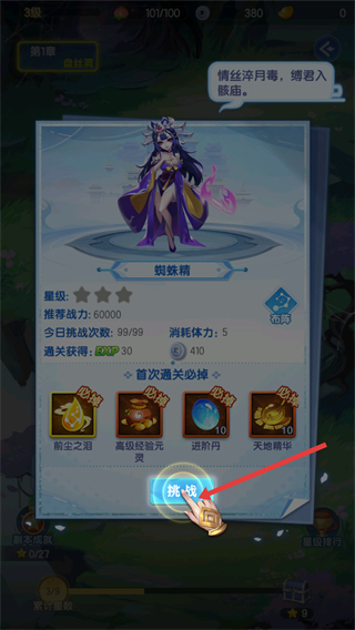 1、會遇到蜘蛛精等敵人,查看其等級、推薦戰力等信息后,點擊挑戰即可發起戰斗。