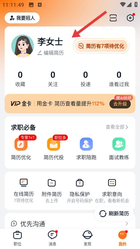 3、成功登錄獵聘安卓版賬號進入我的頁面可查看個人信息,如簡歷待優化提示、求職必備工具入口,還能管理收藏關注投遞等數據開啟求職規劃。