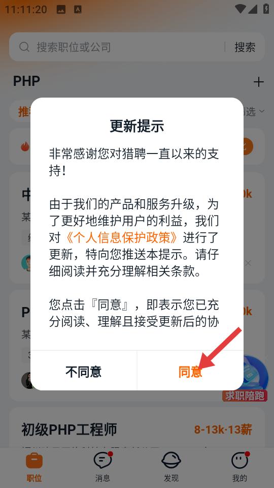 2、登錄獵聘安卓版后若彈出個人信息保護政策更新提示,需認真閱讀條款內容,點擊同意即可繼續使用賬號,不同意則無法正常訪問功能需謹慎抉擇。