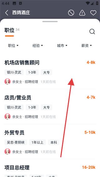 4、在企業詳情頁面,找到職位板塊,點擊進入職位列表,可看到機場店銷售顧問、店員,營業員等崗位,根據需求查看崗位詳情。