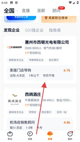 1、打開獵聘APP,進入主界面若有彈窗,可關閉彈窗,接著在頁面中瀏覽,找到發現板塊,點擊進入發現頁面。