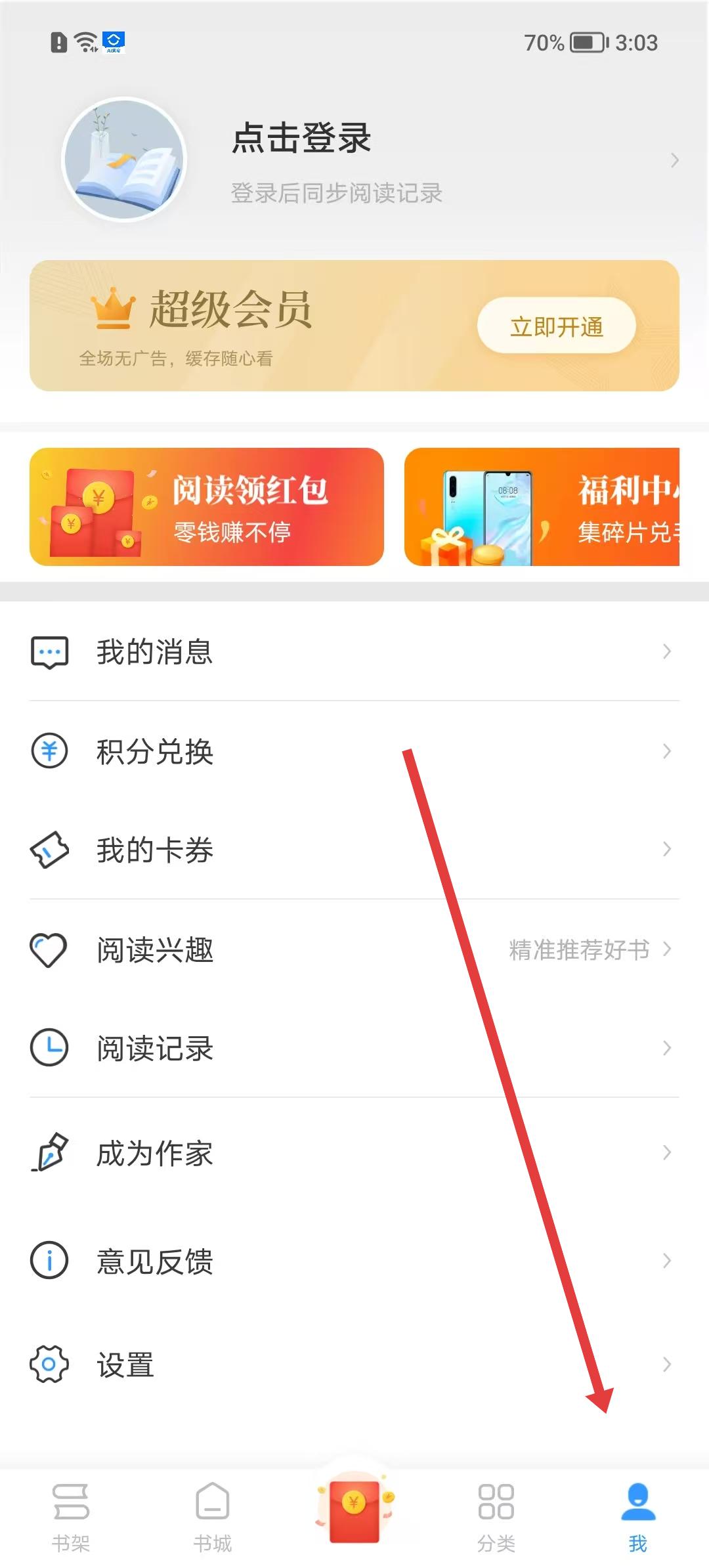 3、進入我的頁面查看積分兌換、閱讀興趣等功能選項,了解軟件的個人功能模塊。