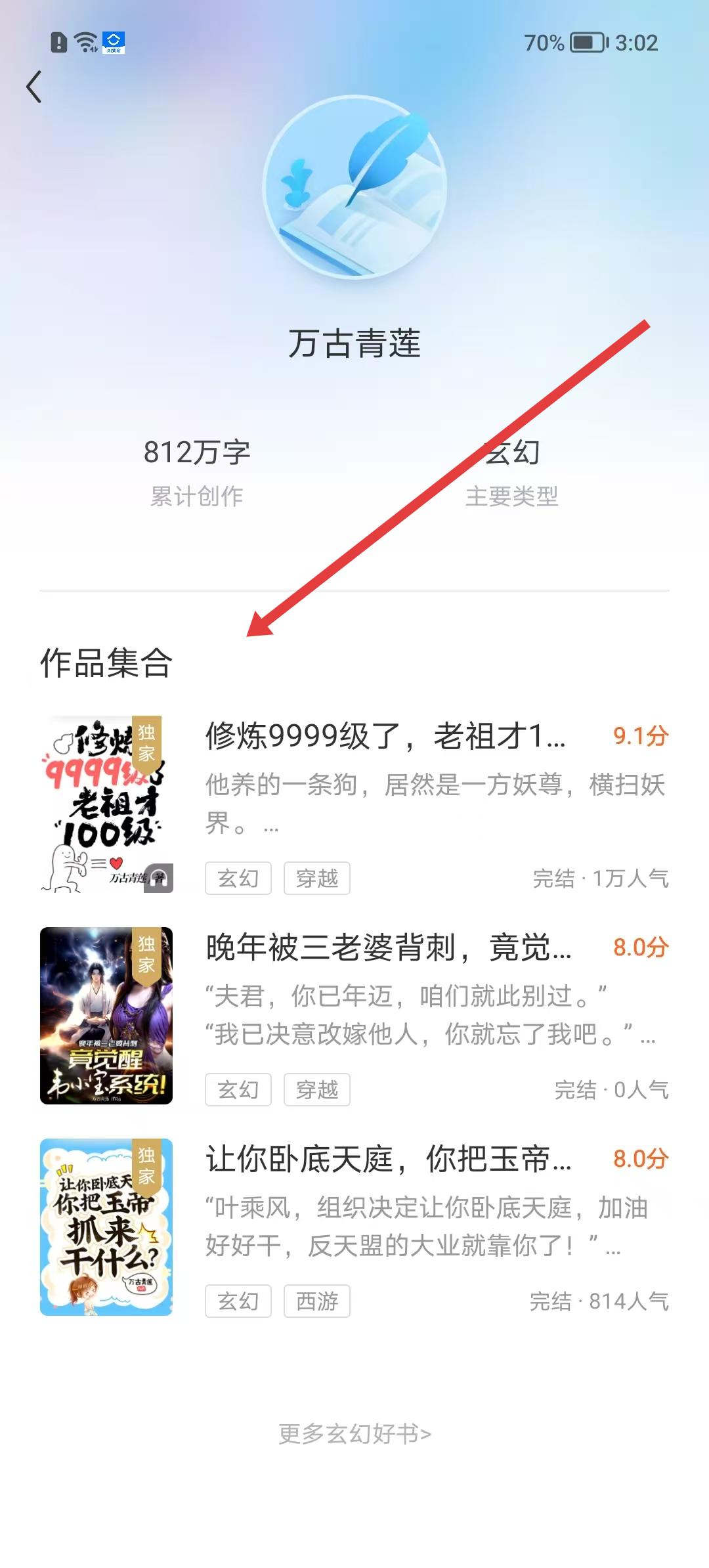 2、進入作者專欄查看萬古青蓮的作品集合,了解晚年被三老婆背刺,竟覺醒韋小寶系統等其他作品的評分與人氣。