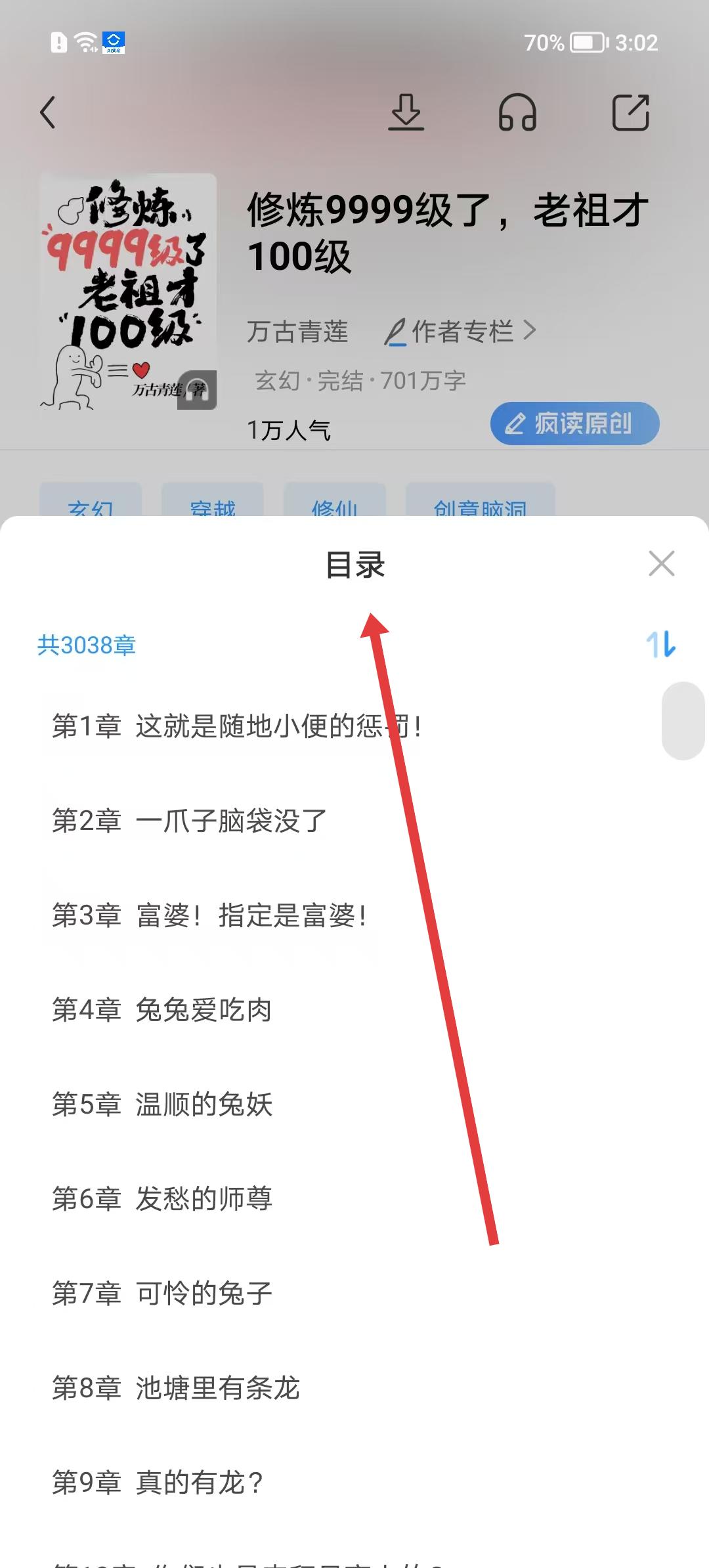 1、進入小說詳情頁,點擊目錄查看修煉9999級了,老祖才100級的章節列表,了解小說章節分布。