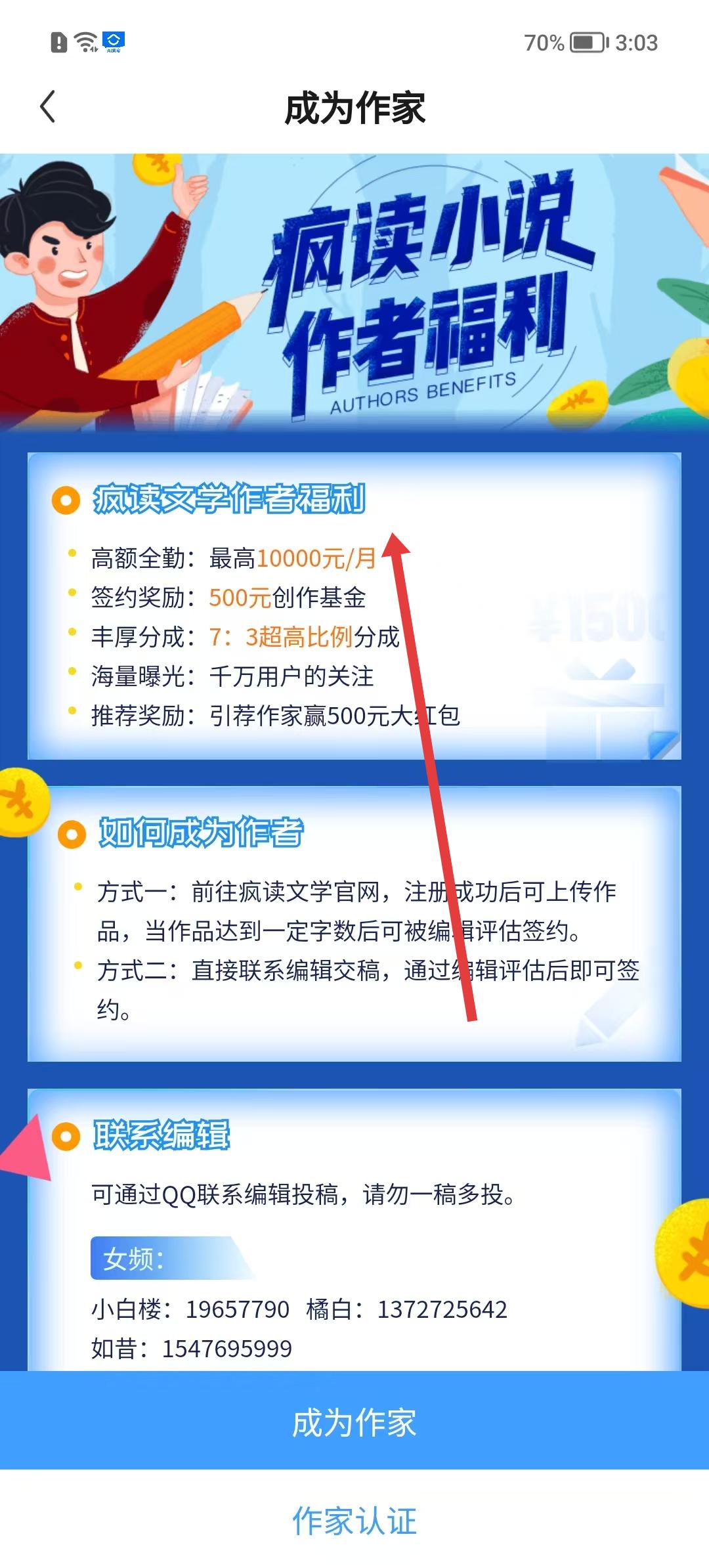 4、點擊成為作家查看瘋讀小說作者福利和成為作者的方式,了解高額全勤、簽約獎勵等福利及投稿流程。