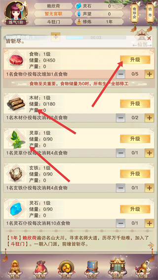 1、可升級食物、木材等資源建筑,提升資源產量,管理資源分配,確保修仙資源充足。
