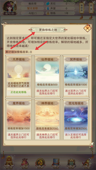 3、可更換修煉之地,選擇凡界、仙界等不同福地,提升修煉效率,解鎖更多福地增加效率。