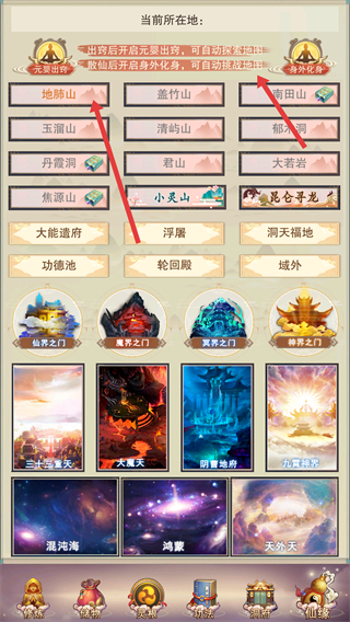 2、可選擇修煉之地如地肺山,不同地域有不同效果,出竅后可開啟靈根出售和肉身化身功能。