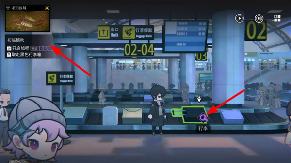 1、在未知區域開啟旅程,按照任務指引在行李提取處獲取黑色行李箱,推進任務進度,解鎖后續的探索內容。