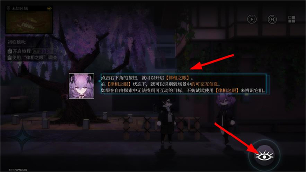 2、點擊右下角按鈕開啟律相之眼,識別場景內的可交互信息,若找不到互動目標,可借助該功能輔助探索,推進流程。