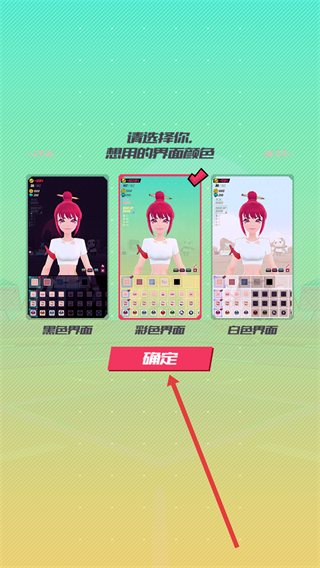 1、選擇界面顏色,有黑色、彩色、白色界面可選,選擇后點擊確定,進入游戲,開始個性化的游戲體驗。