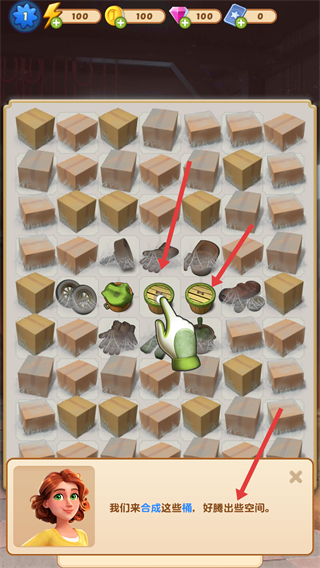 1、會出現布滿箱子的界面,玩家可合成相同的桶,騰出空間,推進清理裝修莊園的進程。