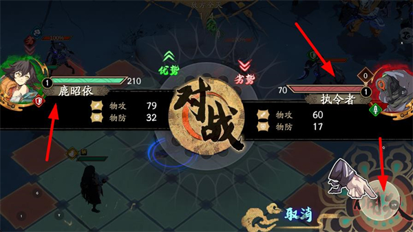 1、看鹿昭依與執令者的屬性面板,確認雙方優勢劣勢后,點擊對應操作按鈕發起攻擊,開啟戰斗進程。