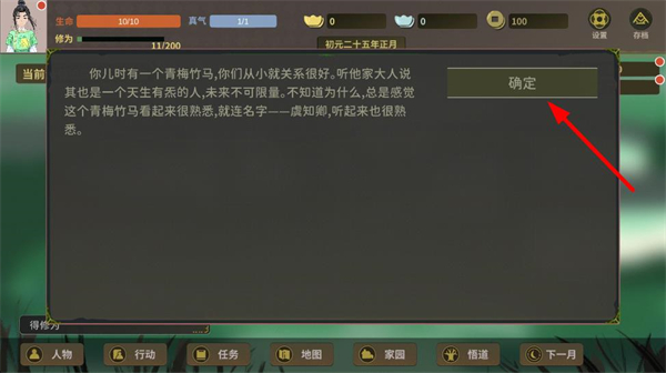 3、會觸發劇情事件,如兒時青梅竹馬的故事,點擊確定推進劇情,解鎖更多修仙背景和人物關系。