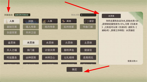 1、選擇天賦組合如人族、妖族等,搭配水靈體等天賦,消耗點數確定后,獲得對應屬性和技能,開啟修仙之路。
