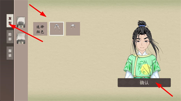 2、可以自定義角色發型,選擇前發、后發樣式和顏色,調整后點擊確認,打造個性化修仙角色形象。
