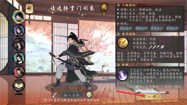 1、可選擇掌門形象,輸入名稱,了解人物特征、武學流派等信息,選擇后點擊下一步繼續。