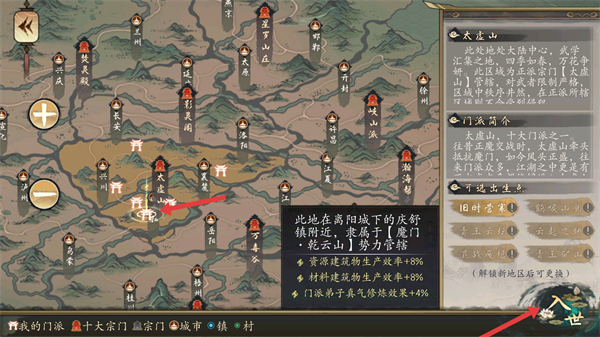 2、可在地圖上選擇門派所在地,如大虛山等,不同地點有不同資源產出和效果加成,選擇后可入人世發展。