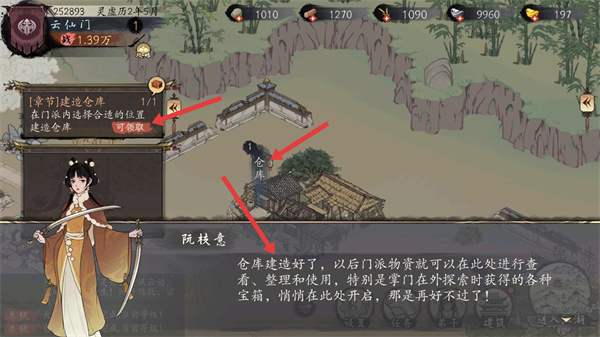 4、在門派內建造倉庫,選擇合適位置建造后,可用于查看、整理和使用門派資源,助力門派發展。