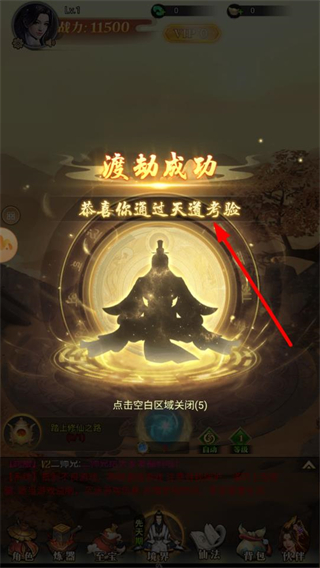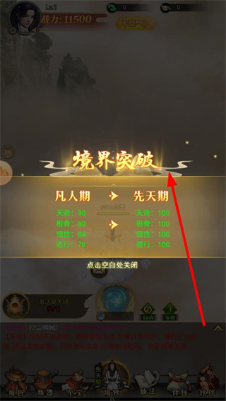 2、實現境界突破,從凡人期提升至先天期,增強天資、根骨等屬性,優化修仙者的綜合能力,推進修仙劇情。