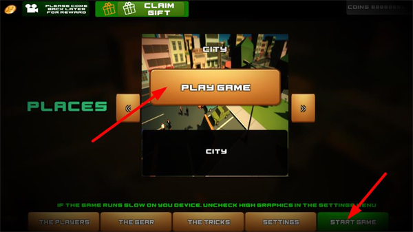 2、選定玩家后切換到場景選擇界面,找到PLAY GAME按鈕并點擊,選擇CITY場景,隨后點擊START GAME進入游戲。