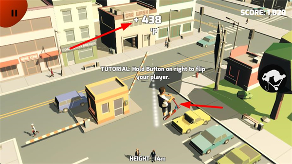 4、完成翻轉動作后會獲得得分,繼續按住右側按鈕做特技,積累更多分數,同時留意場景里的障礙物,保持動作連貫。
