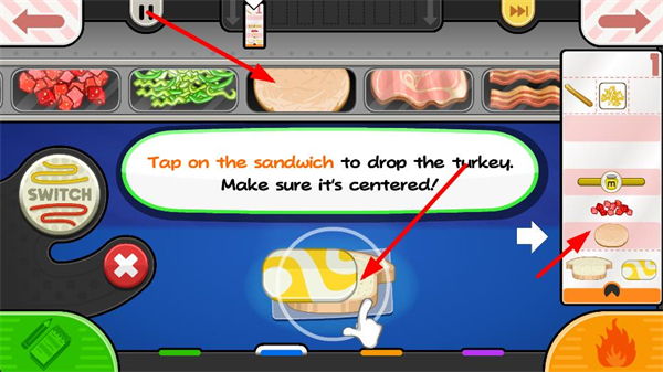 2、繼續添加配料,等火雞肉居中后點擊三明治,把火雞肉放到面包上,確保位置居中,貼合訂單的配料擺放要求。