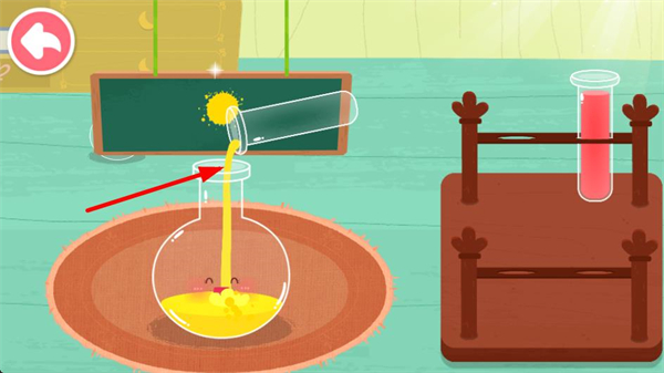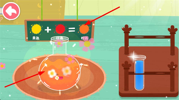 2、查看黑板上的色彩公式,將對應顏色的液體混合,燒瓶內會呈現出新的顏色,同時右側試管會出現匹配的液體樣式。