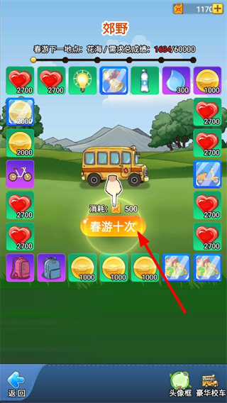 3、點擊春游十次開展郊野春游,消耗資源獲取心得、學費等獎勵,豐富校園經營物資,助力校園建設和學生培養。