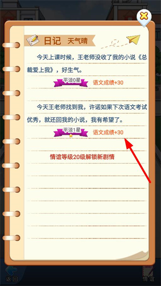 2、解鎖新劇情提升語文成績,完成情誼等級任務解鎖劇情,獲取語文成績加成,提升學生學習成果和班級排名。