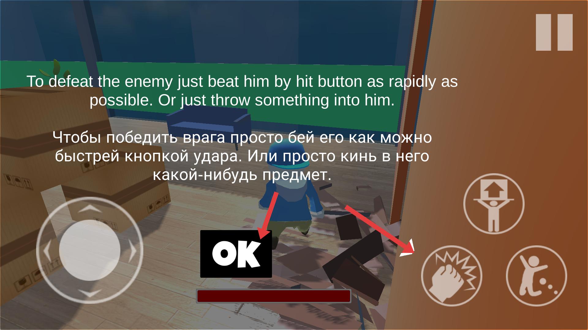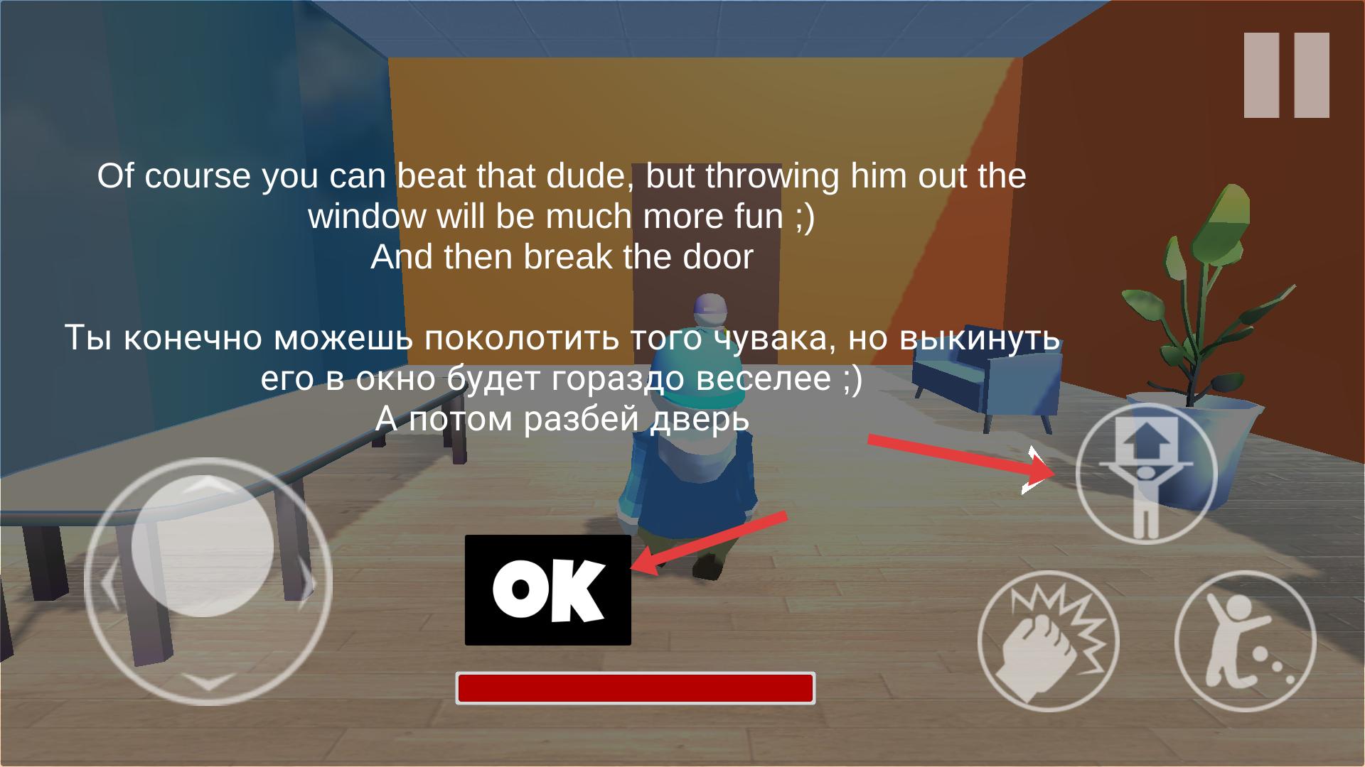 3、遇到提示文字時,閱讀內容,了解可將敵人扔出窗外等玩法,點擊OK關閉提示,然后嘗試相關操作,增加游戲樂趣。