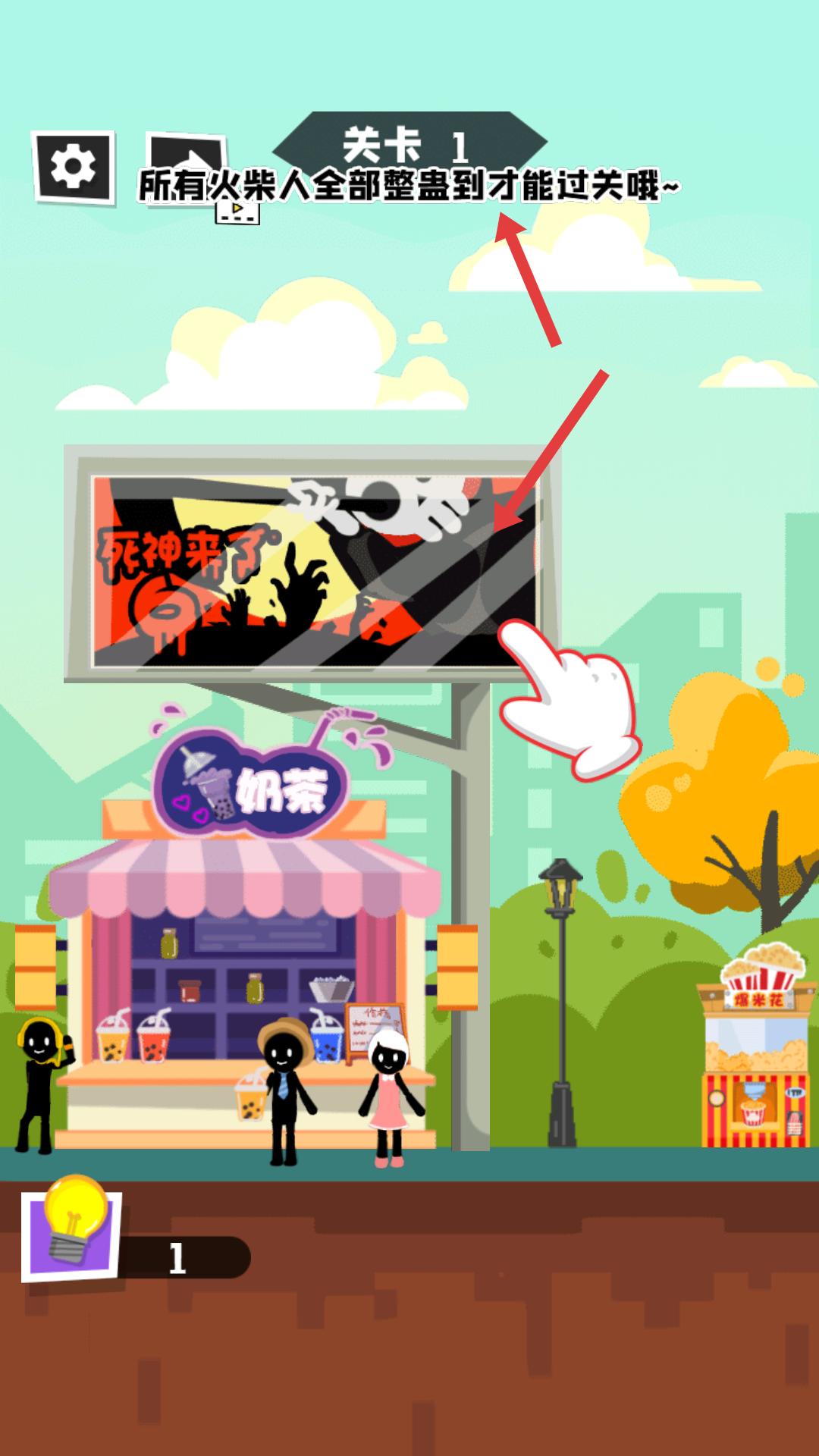 2、進入關卡1,提示所有火柴人全部整蠱到才能過關,按照指引點擊廣告牌,觸發整蠱操作,推進關卡。
