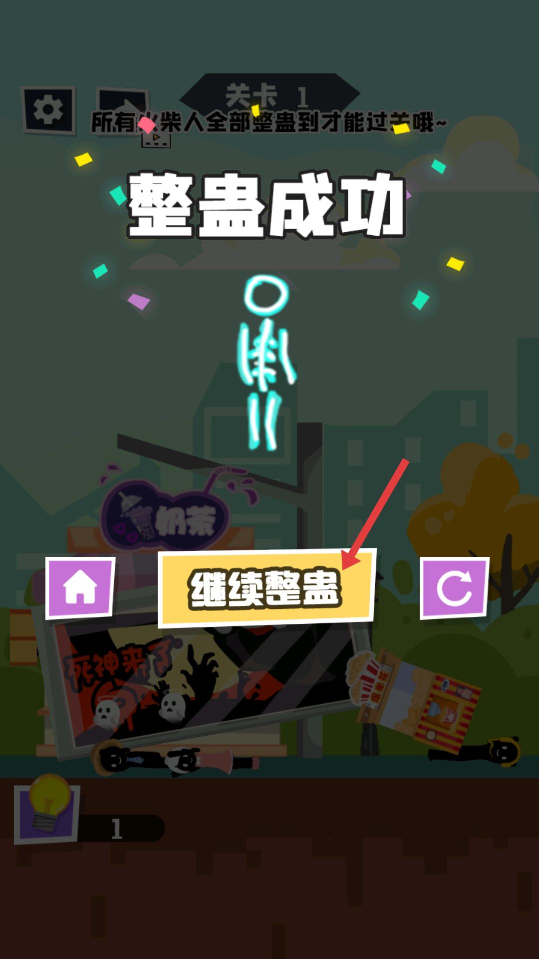 3、整蠱成功后,界面顯示整蠱成功,點擊繼續整蠱,可繼續對其他火柴人進行整蠱,完成關卡目標。