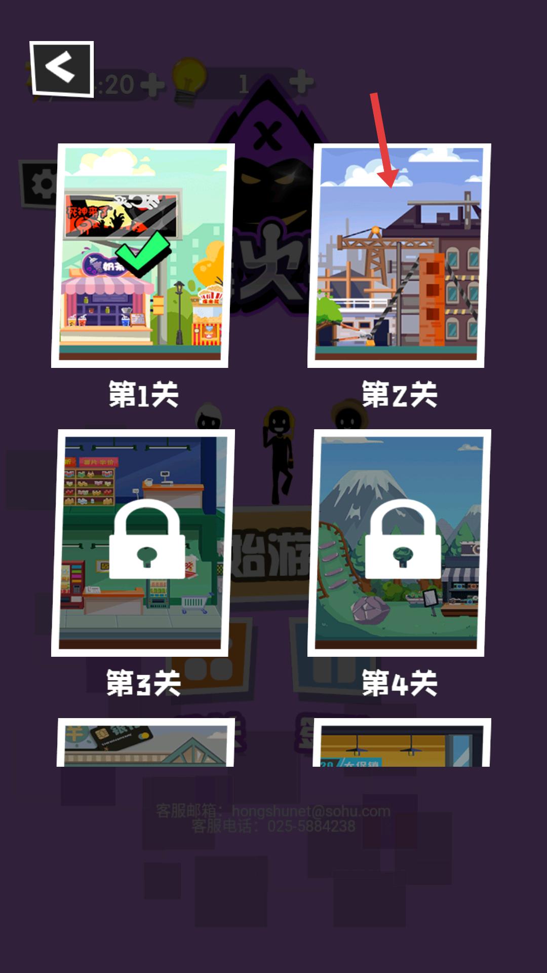 4、關卡選擇界面,第一關已通過,點擊第二關的圖標,進入新的關卡,繼續整蠱火柴人的游戲挑戰。