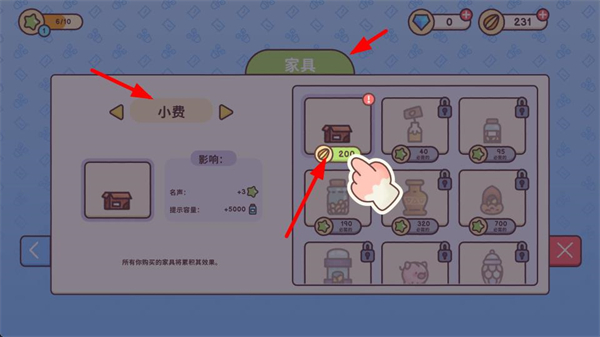 3、切換到小費界面,花費20金幣購買道具,該道具可增加3點名聲和5000點提示容量,助力小店經營相關的數值提升。