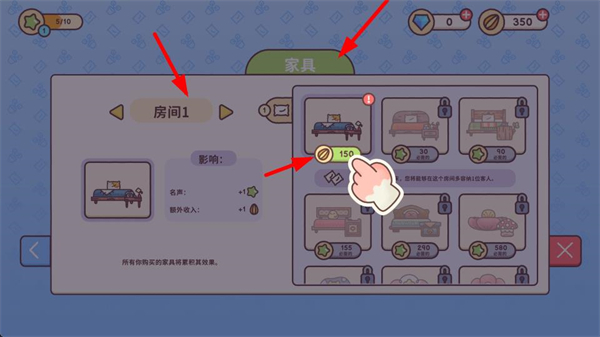 1、在家具界面選擇房間1,可花費150金幣購買家具,購買后能提升名聲和額外收入,所有購買的家具會累積其效果。