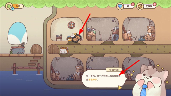 2、進入樹屋場景里布置家具后,能接待客人入住,后續倉鼠小店會提示第一次付款需要拿起金色種子,按提示推進流程。