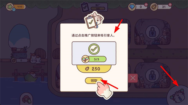 4、點擊推廣按鈕吸引客人,完成3次推廣后可領取250金幣獎勵,通過這類操作積累資源,推進小店的經營進度。