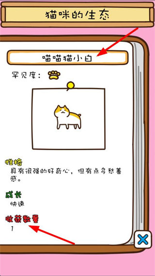 4、作物成熟后可收獲對應的貓咪,查看貓咪的生態界面,能了解其罕見度性格等信息,同時記錄收獲的數量。