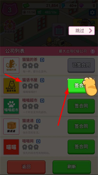 4、選擇貓語書屋等公司簽合同,點擊簽合同按鈕,與多家公司建立合作,壯大公司規模。