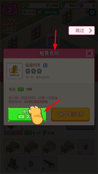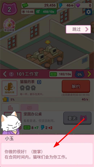2、簽訂合同后,在合同時間內貓咪會為你工作,小玉會給予鼓勵,同時可查看工作室的收益等情況,推進公司運營。
