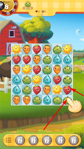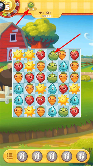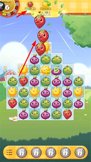 1、界面分布著草莓胡蘿卜等元素,可通過移動元素位置來進行消除,同時注意上方剩余步數,按指引操作。