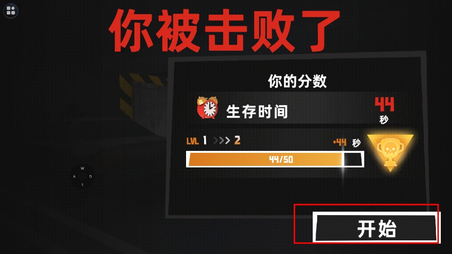 4、如果游戲失敗,出現你被擊敗了的界面,點擊下方的開始按鈕,可重新開啟游戲,再次挑戰恐怖冒險逃生。