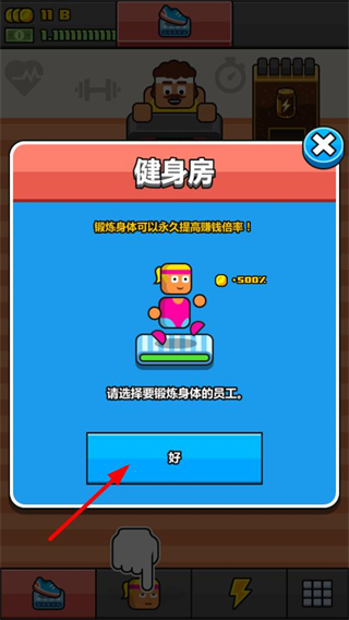 2、彈出健身房提示界面后,點擊好按鈕,進入健身房功能選擇界面,準備為員工安排健身提升收益。
