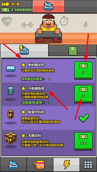 4、進入健身房升級界面,點擊對應功能的綠色按鈕,消耗資源解鎖新跑步機等功能,優化健身收益效果。