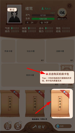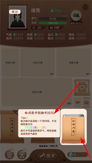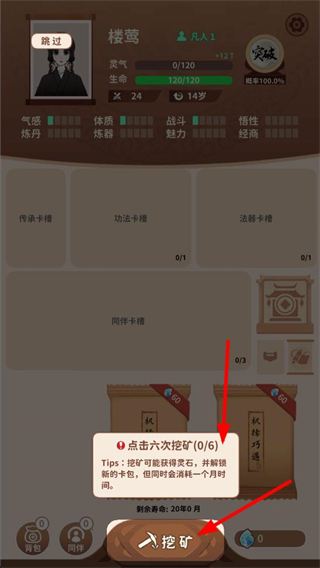1、可點擊挖礦,每次挖礦可能獲得靈石并解鎖新卡包,需點擊六次挖礦,挖礦會消耗一個月時間,積累資源助力修仙。