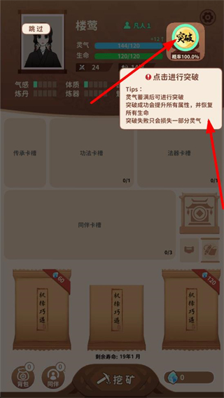 4、靈氣蓄滿后點擊突破,突破成功提升所有屬性并恢復生命,失敗只損失部分靈氣,通過突破提升修仙境界。