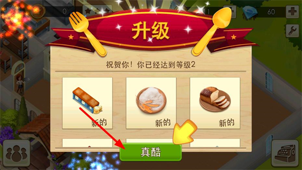 4、升級后會解鎖新食材,點擊真酷按鈕確認,即可獲取新的烹飪資源,豐富餐廳的菜品種類。